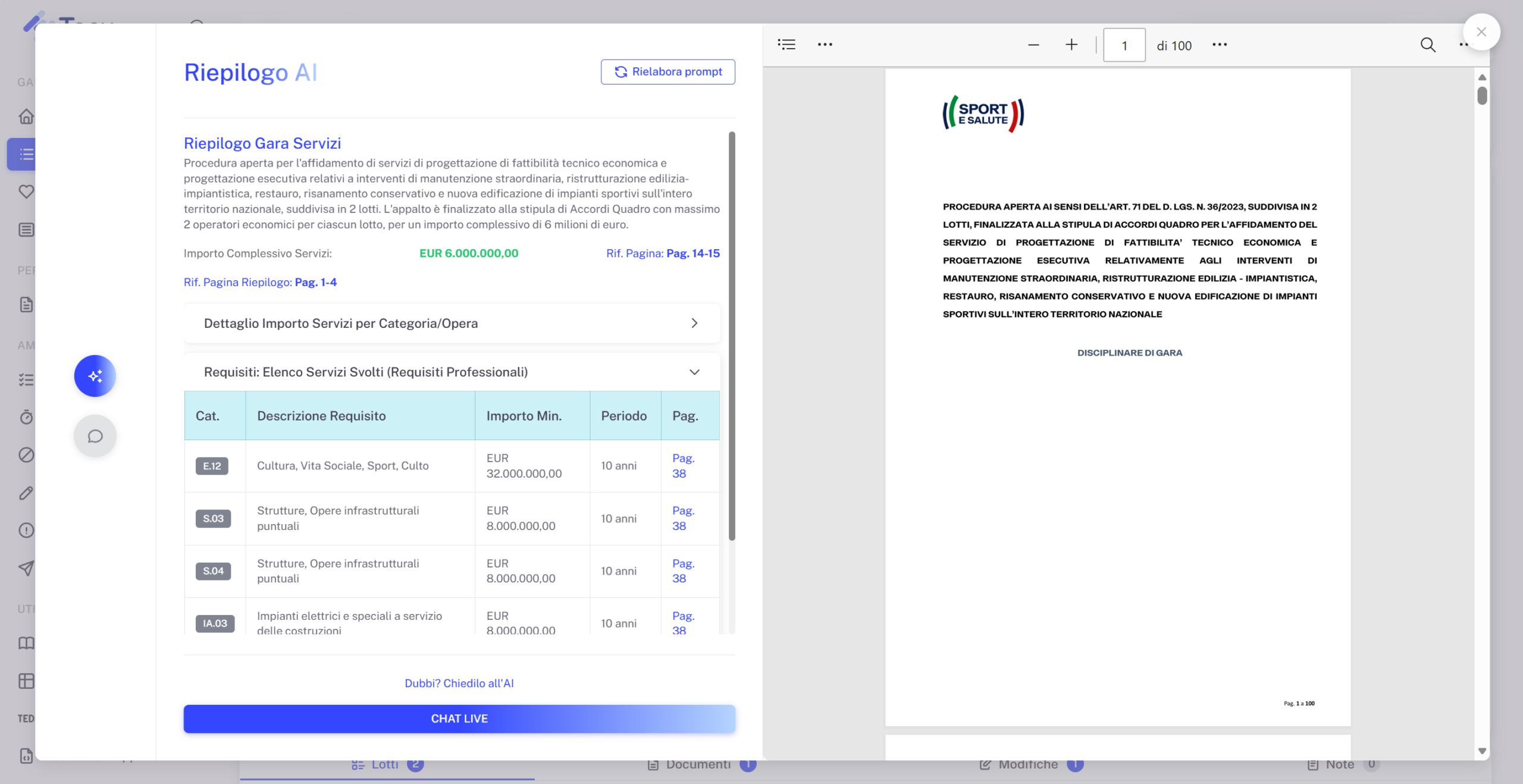 Consulta il riepilogo del disciplinare e chiedi all'AI integrata le informazioni che ti servono.